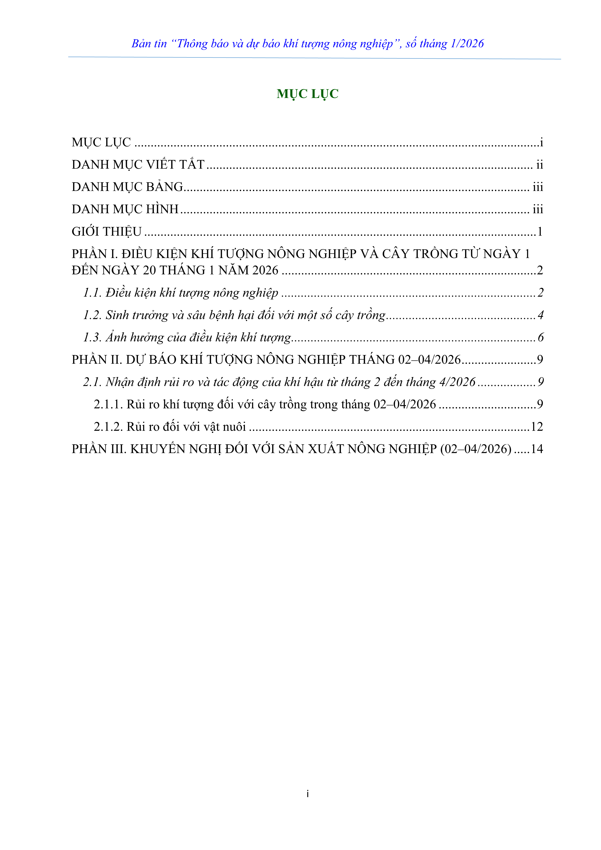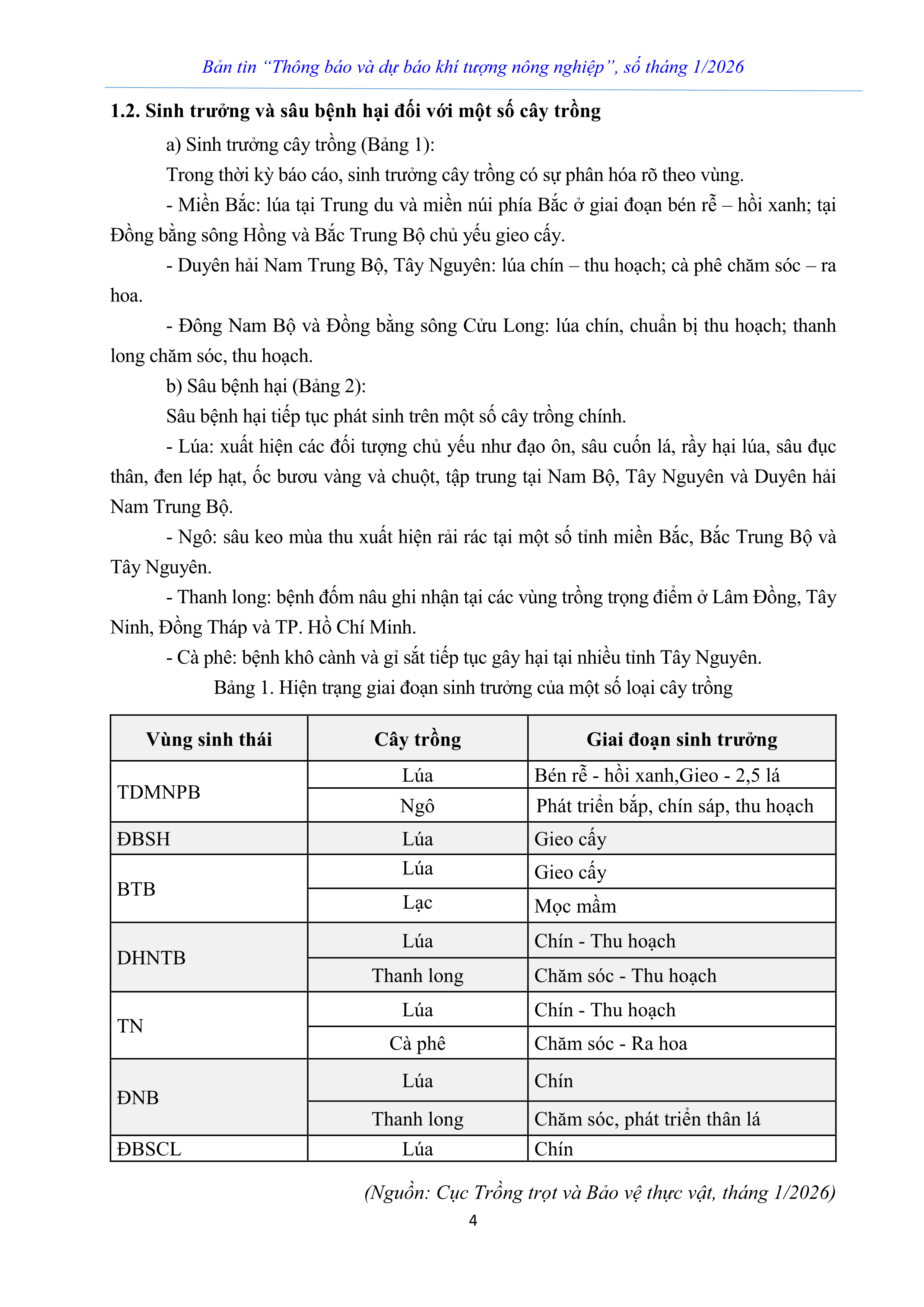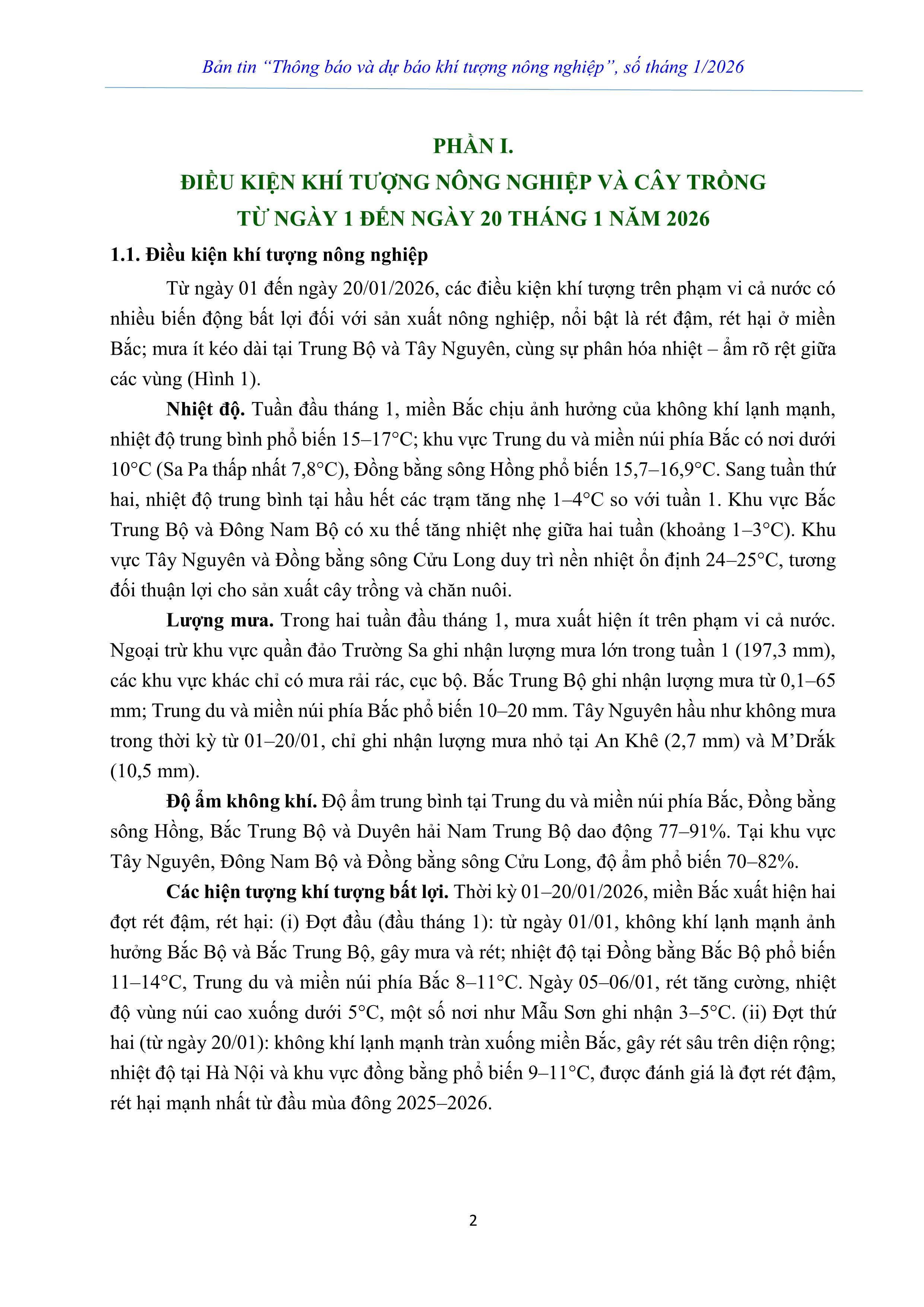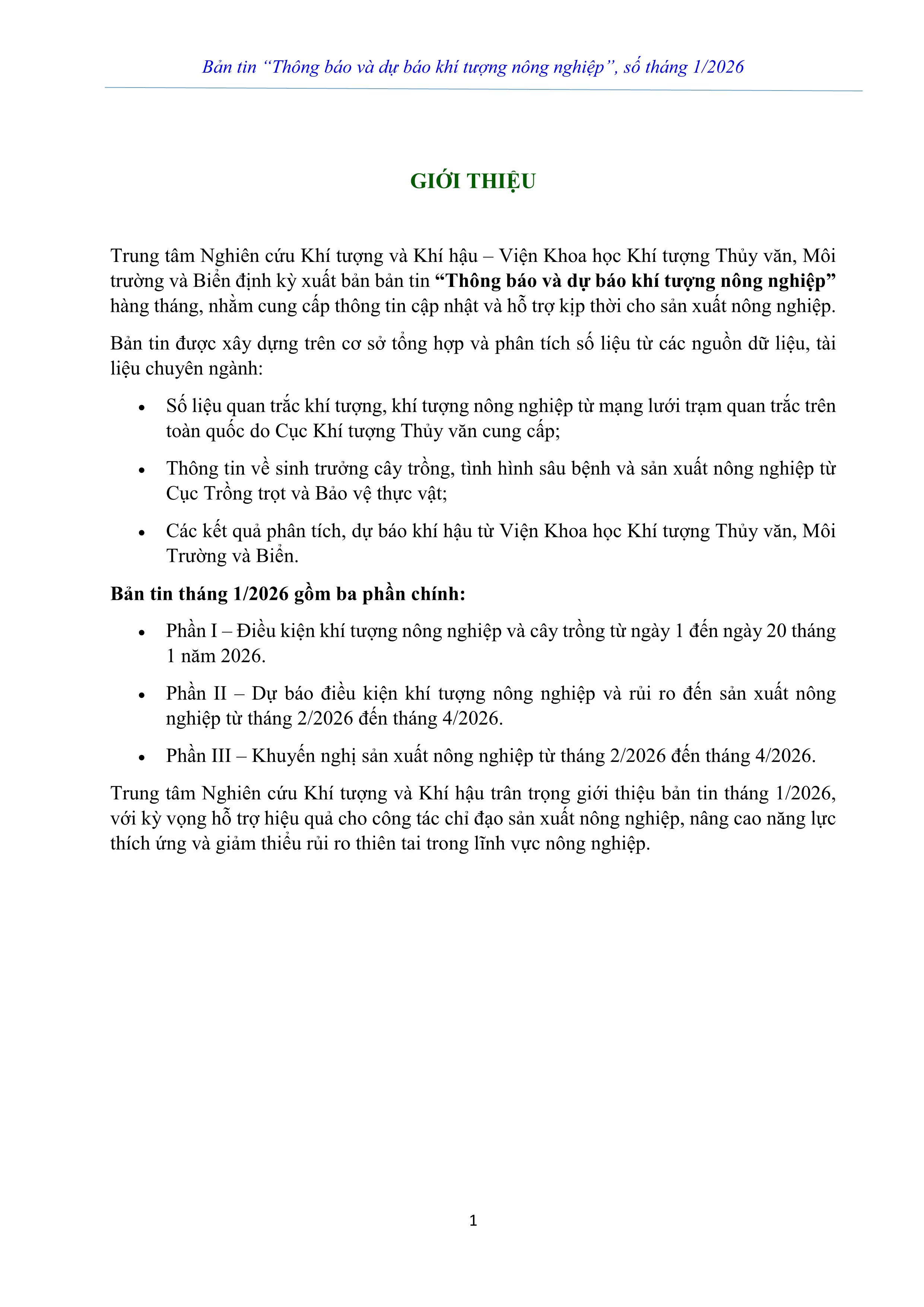 THÔNG BÁO VÀ DỰ BÁO KHÍ TƯỢNG NÔNG NGHIỆP SỐ THÁNG 01 NĂM 2026