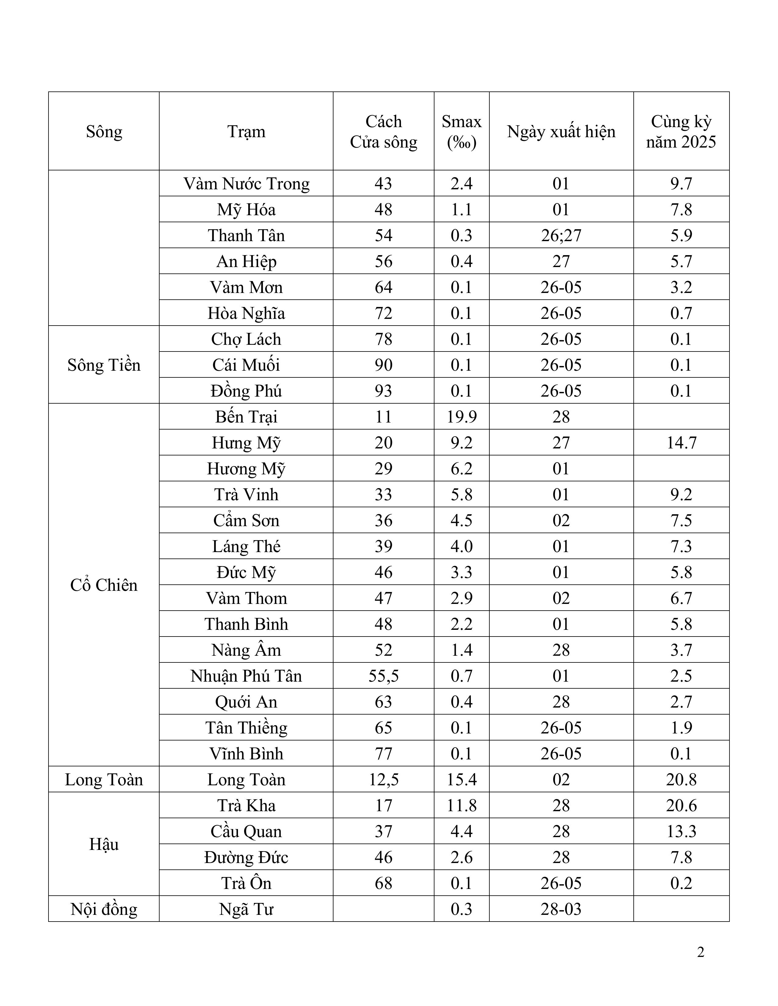 TIN DỰ BÁO XÂM NHẬP MẶN TRÊN TỈNH VĨNH LONG (Từ ngày 19 đến ngày 28/02/2026)