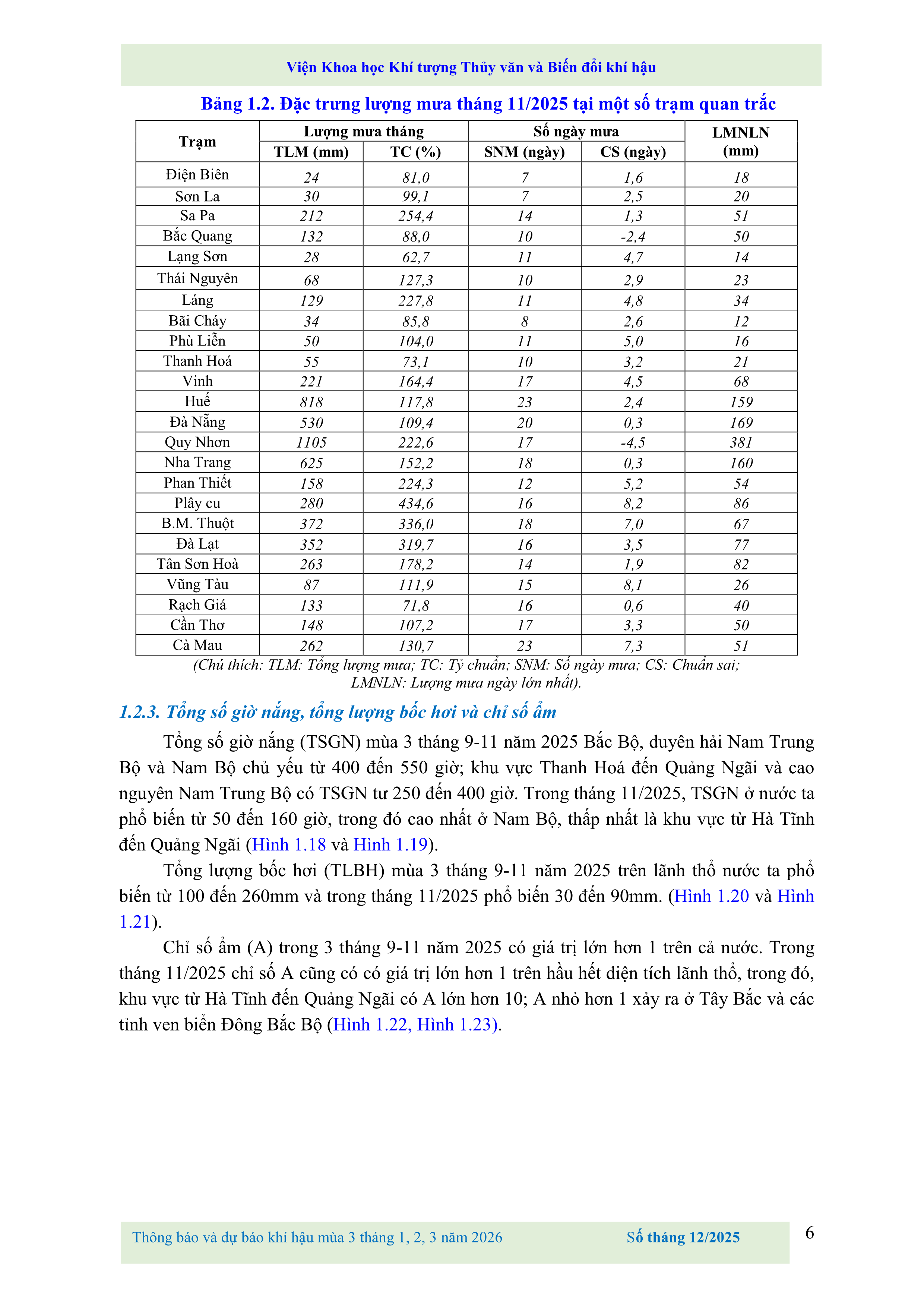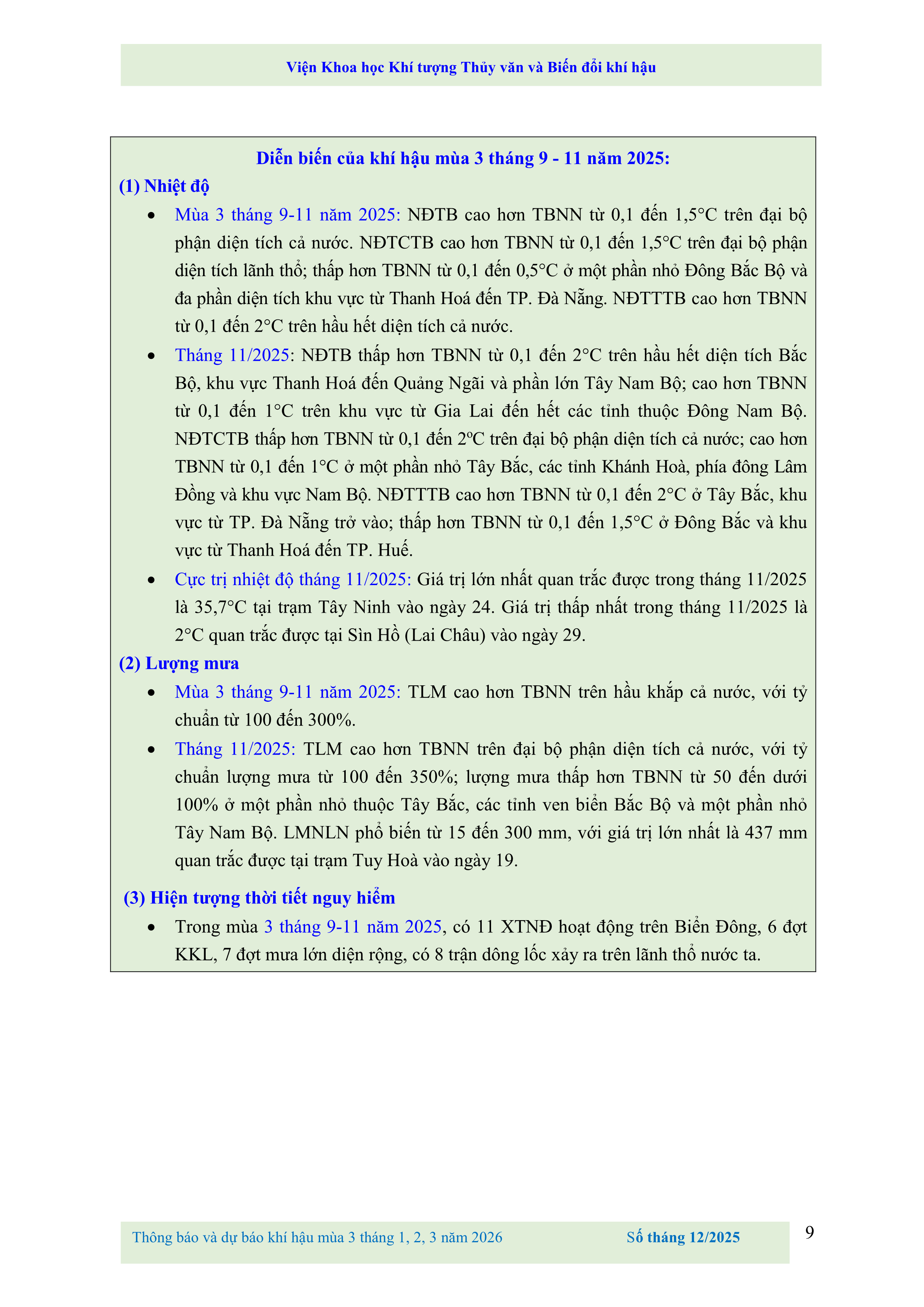 THÔNG BÁO VÀ DỰ BÁO KHÍ TƯỢNG NÔNG NGHIỆP SỐ THÁNG 12 NĂM 2025