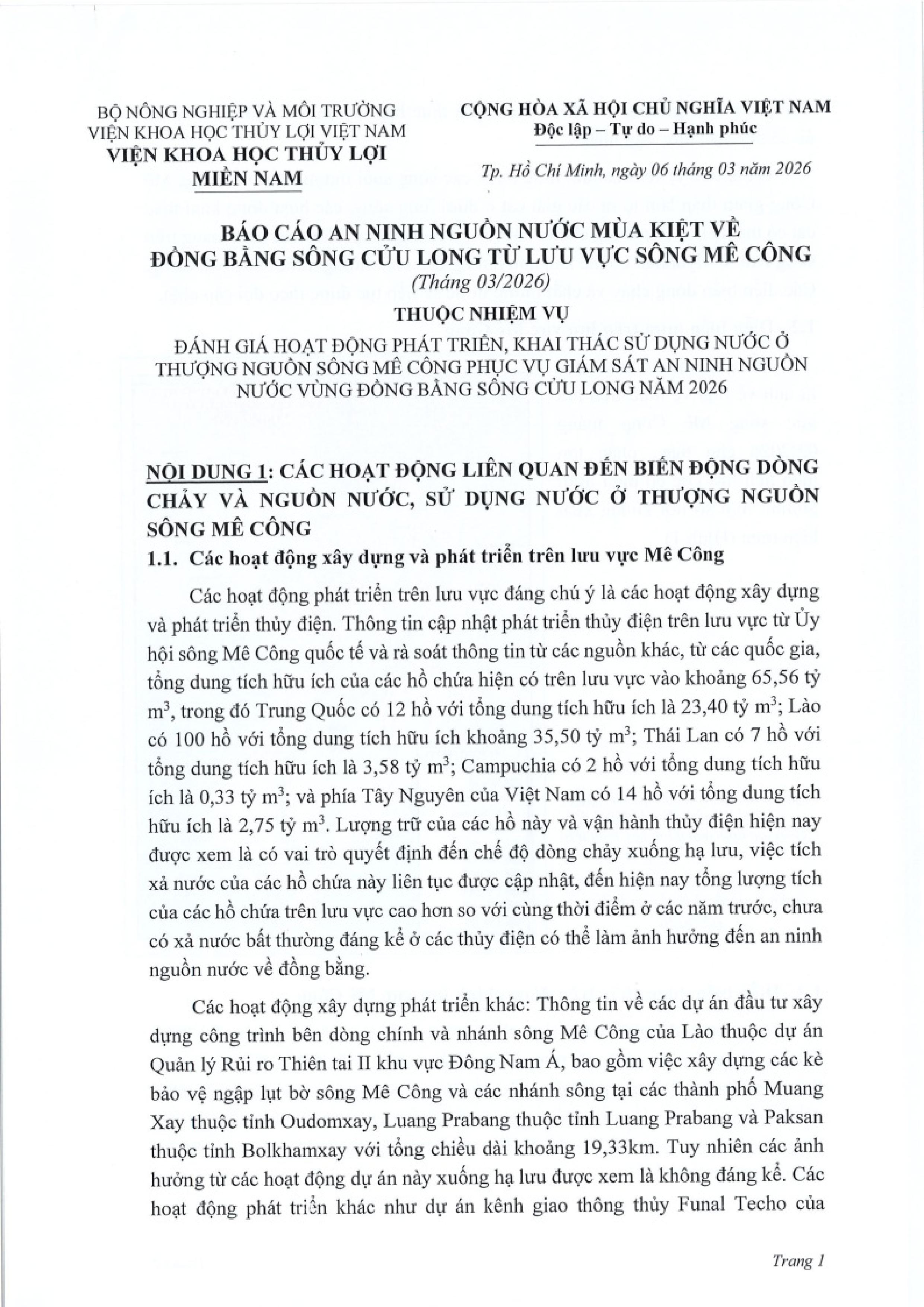 BÁO CÁO AN NINH NGUỒN NƯỚC MÙA KIỆT VỀ ĐỒNG BẰNG SÔNG CỬU LONG TỪ LƯU VỰC SÔNG MÊ CÔNG (Tháng 3/2026)