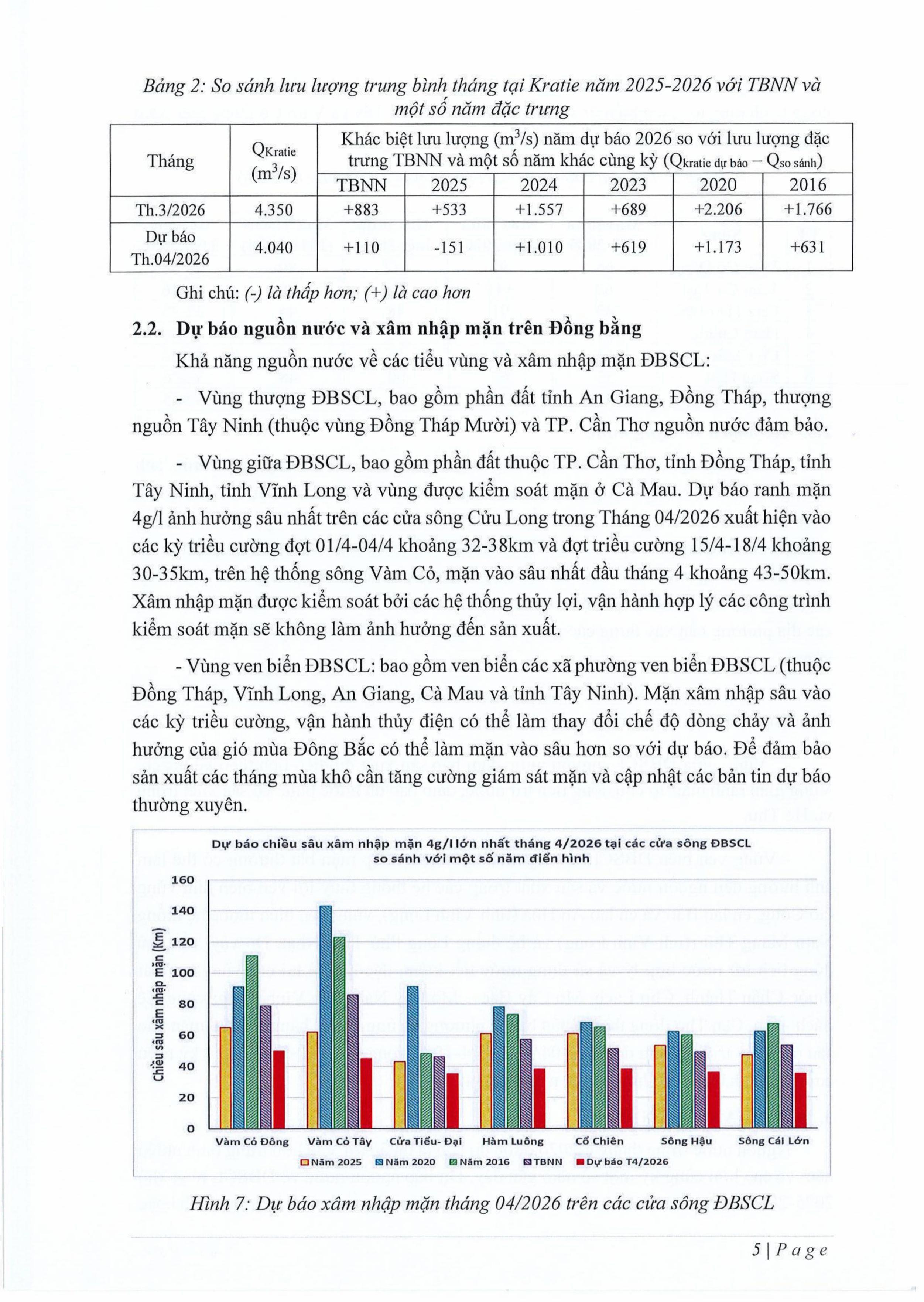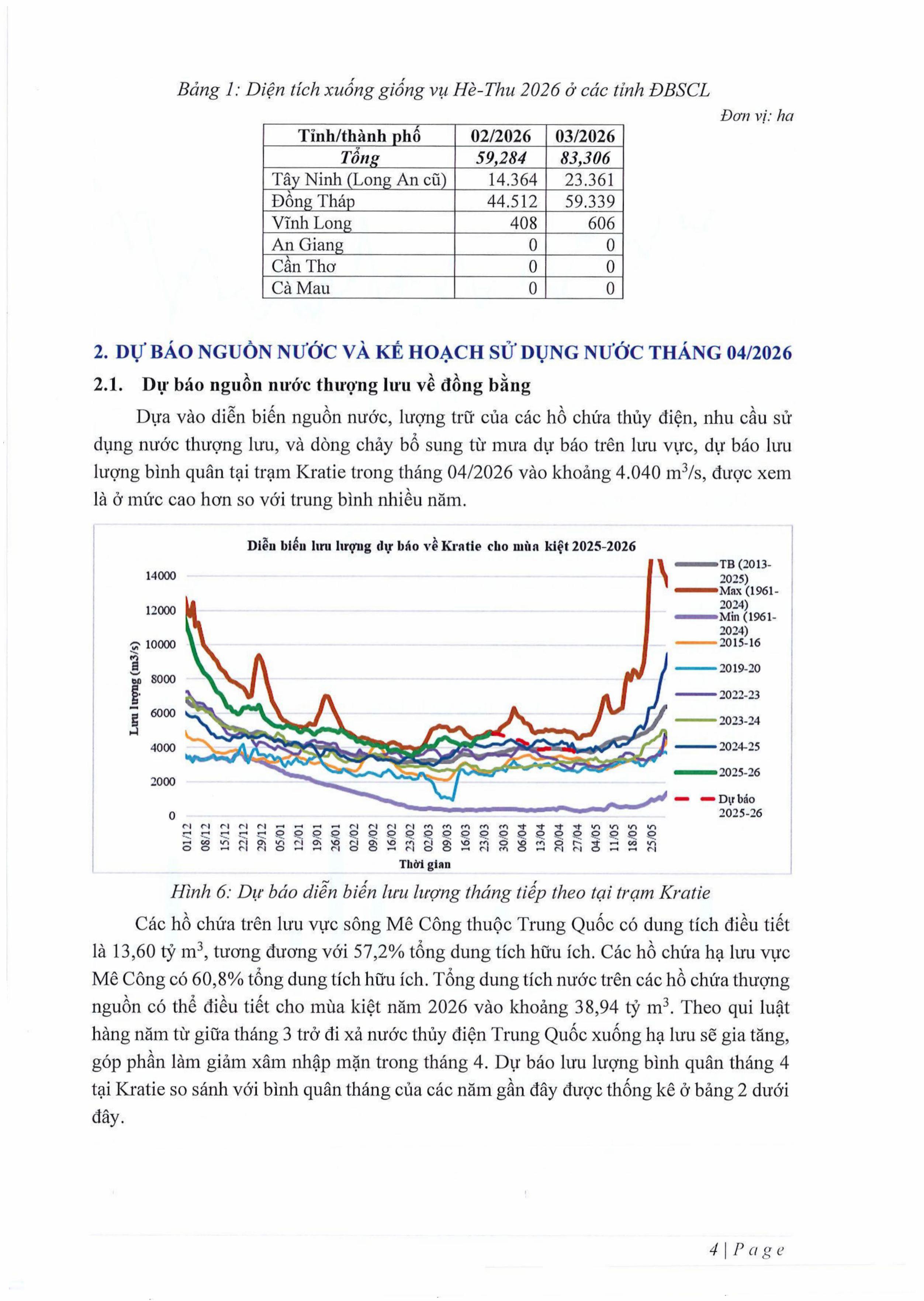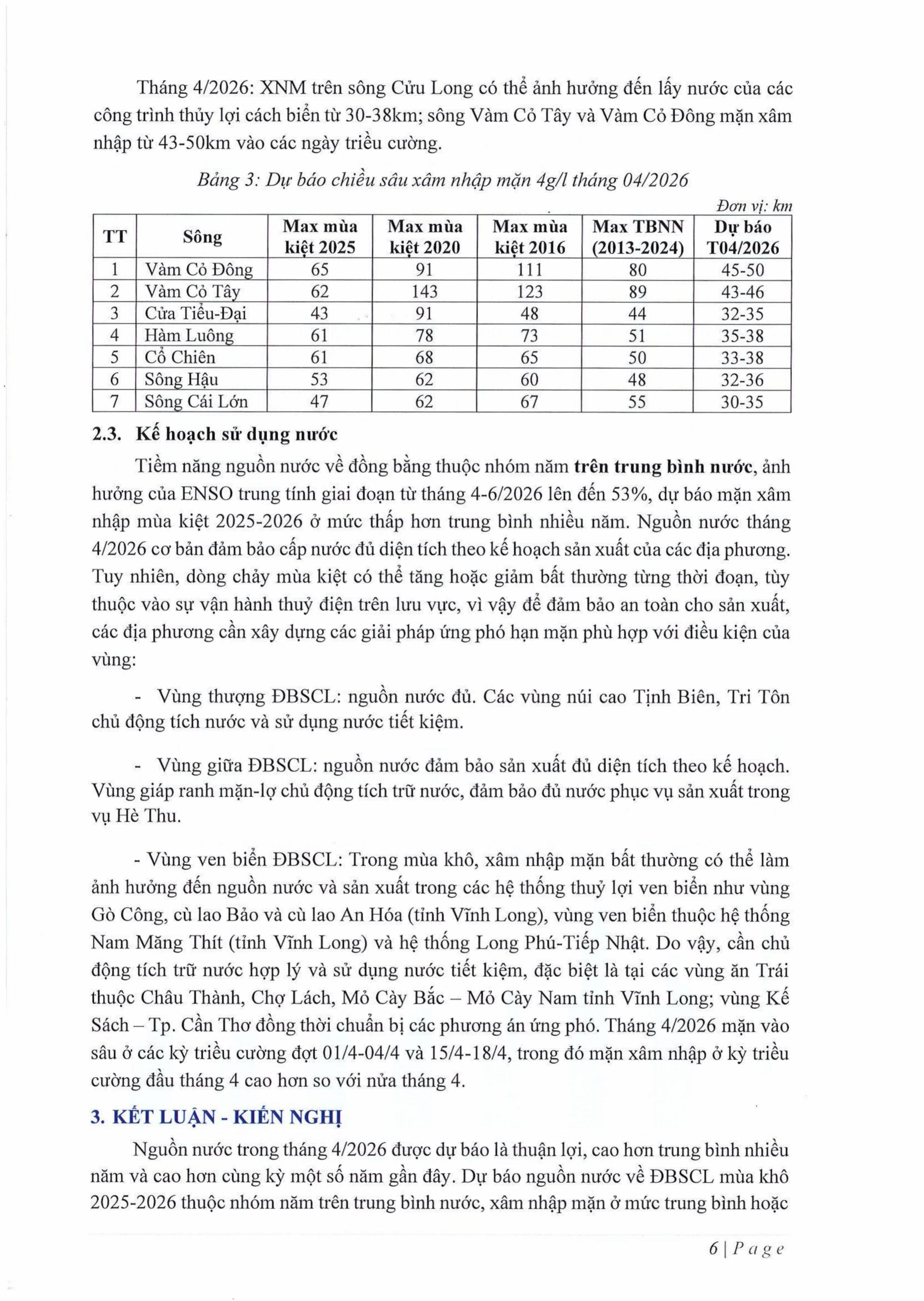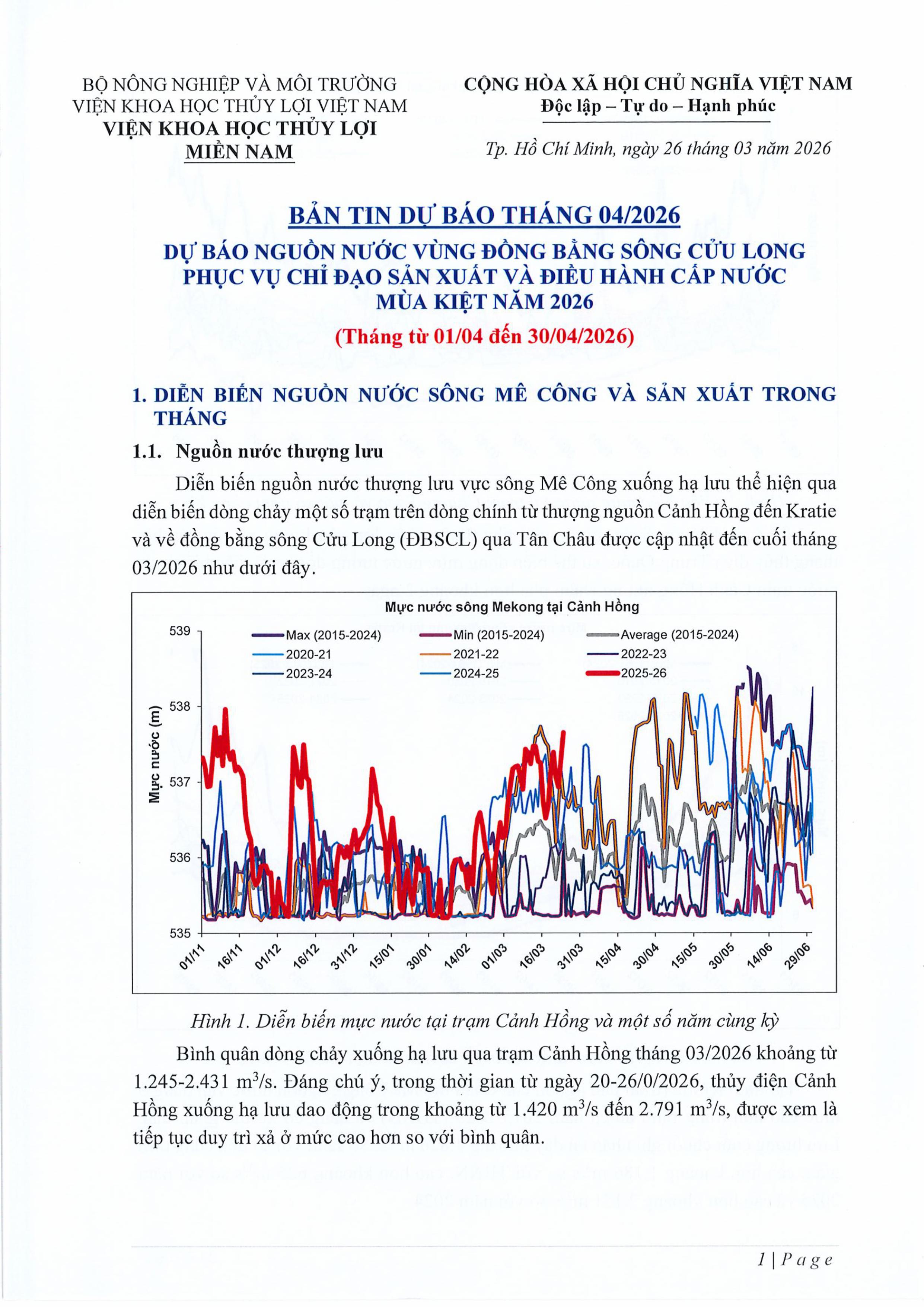 DỰ BÁO NGUỒN NƯỚC VÙNG ĐỒNG BẰNG SÔNG CỬU LONG PHỤC VỤ CHỈ ĐẠO SẢN XUẤT VÀ ĐIỀU HÀNH CẤP NƯỚC MÙA KIỆT NĂM 2026 (Tháng từ 01/4 đến 30/4/2026)