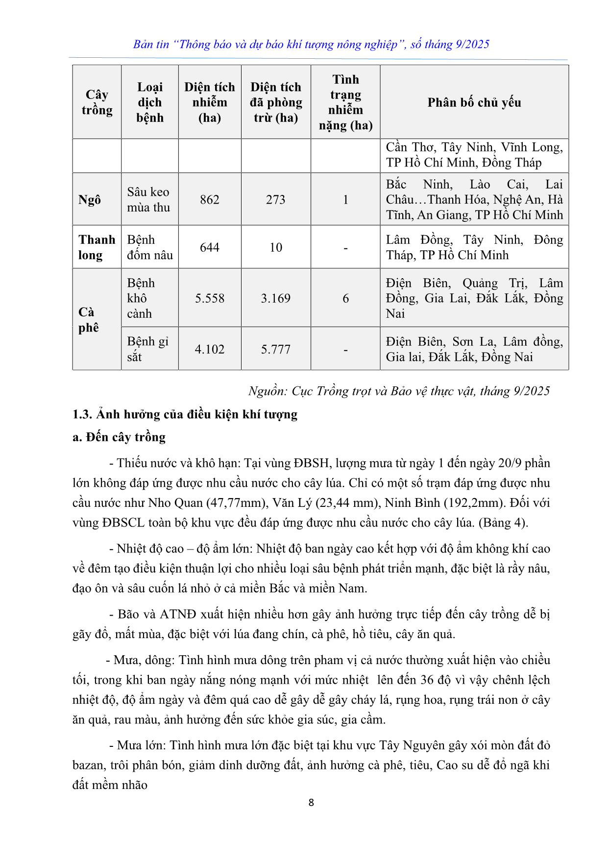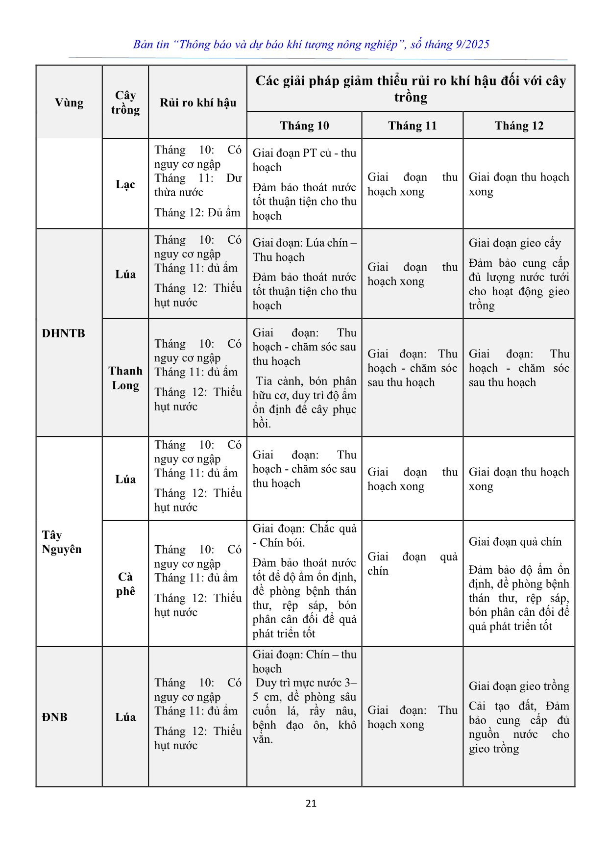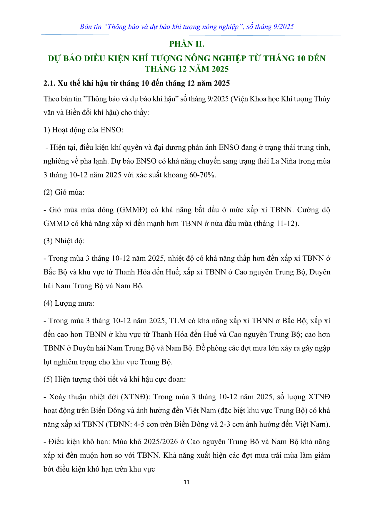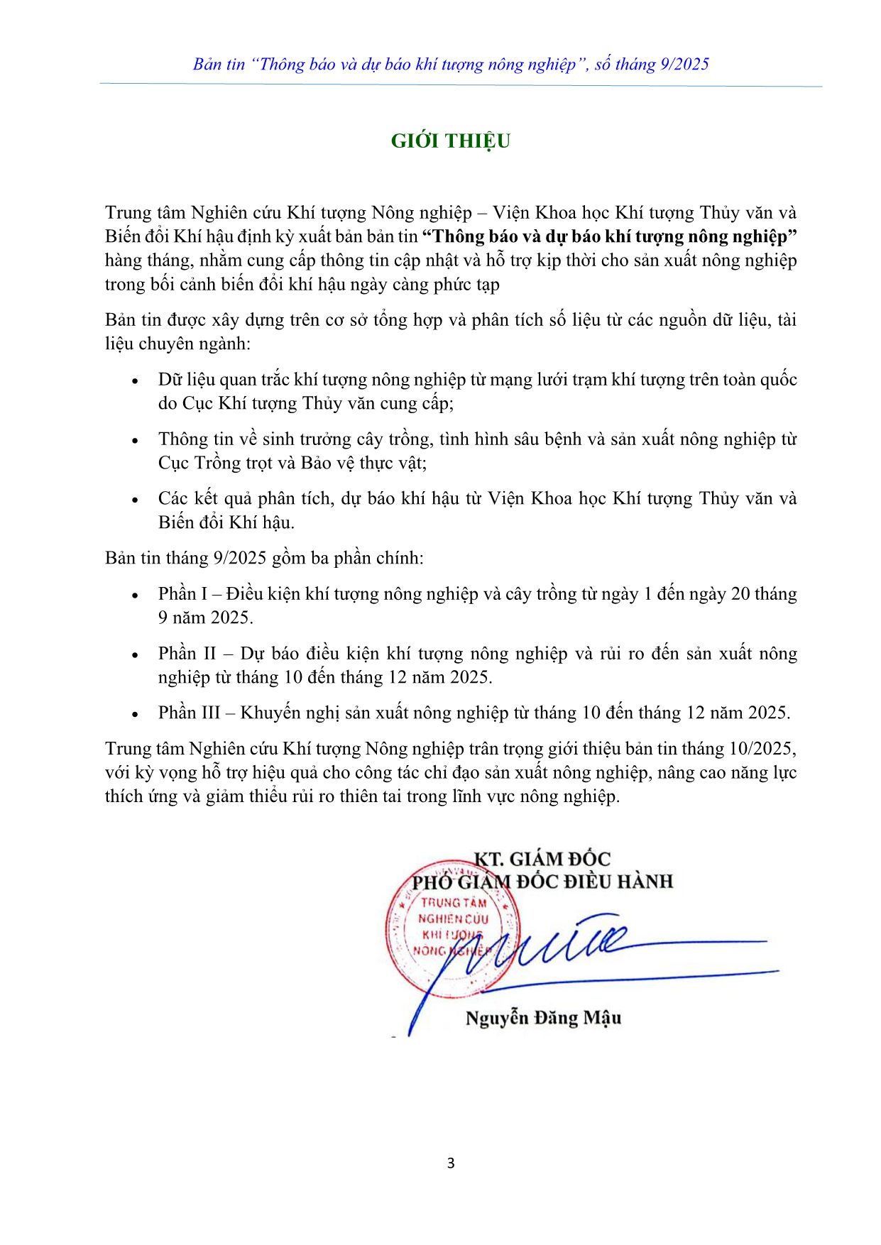 THÔNG BÁO VÀ DỰ BÁO KHÍ TƯỢNG NÔNG NGHIỆP SỐ THÁNG 9 NĂM 2025