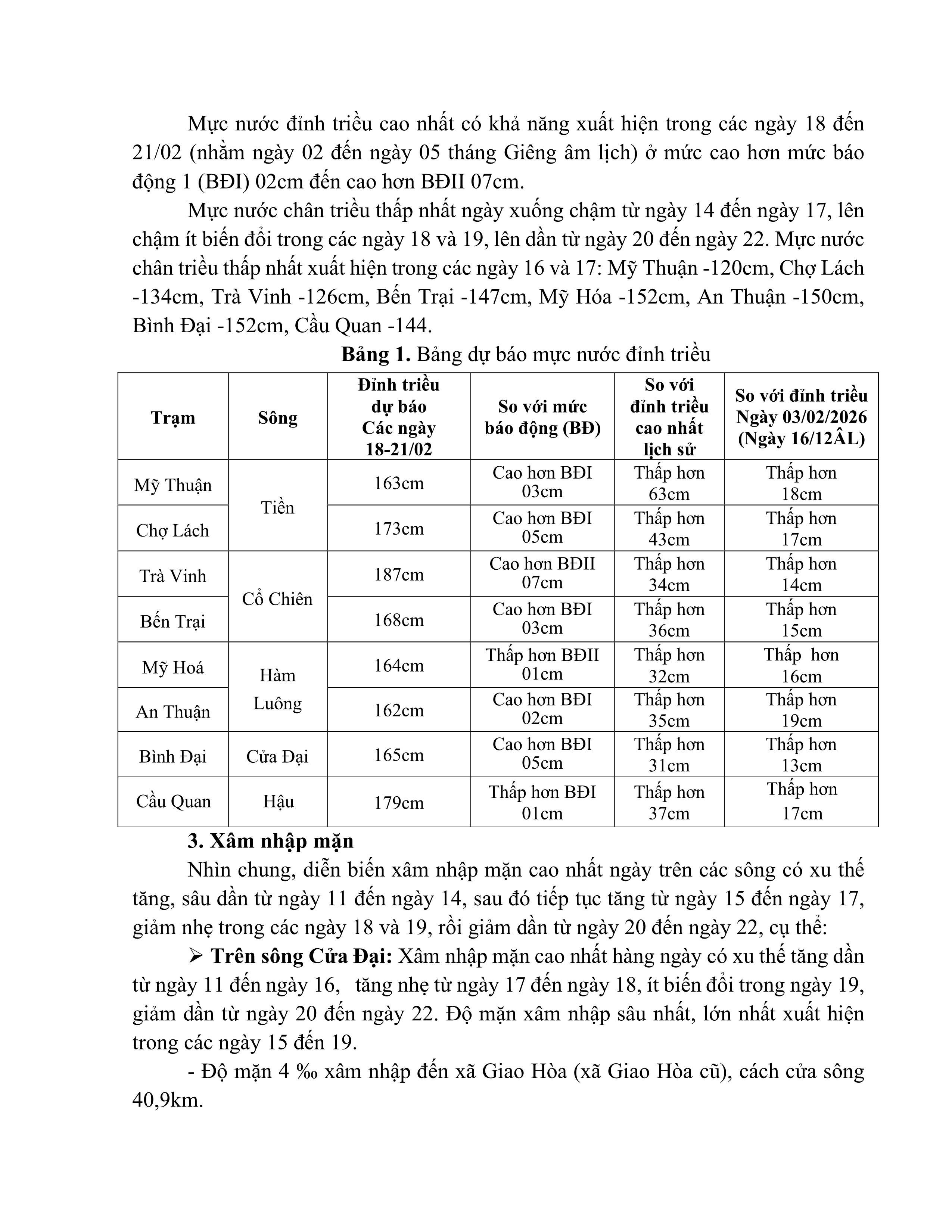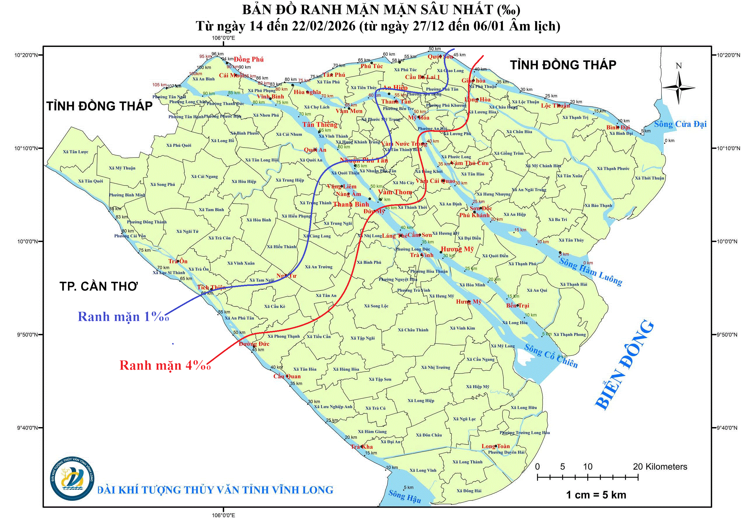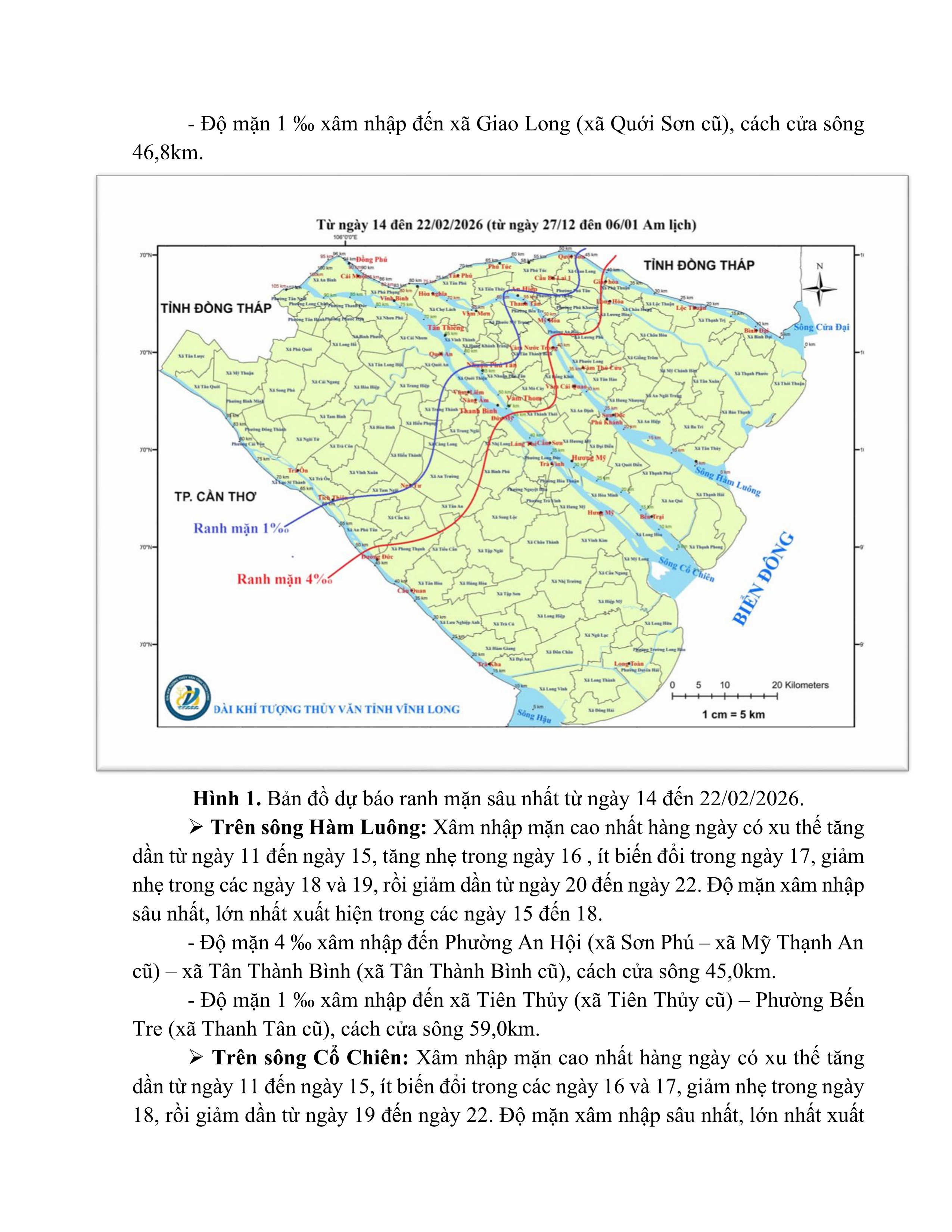 TIN DỰ BÁO XÂM NHẬP MẶN TRÊN TỈNH VĨNH LONG (Từ ngày 19 đến ngày 28/02/2026)