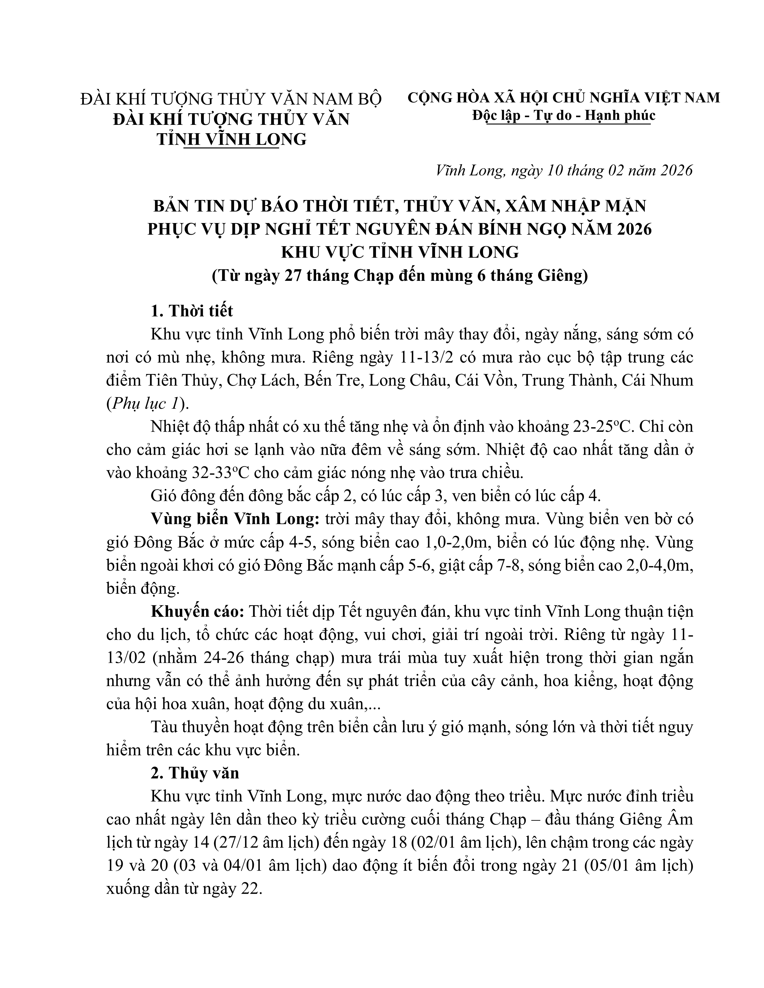 BẢN TIN DỰ BÁO THỜI TIẾT, THỦY VĂN, XÂM NHẬP MẶN PHỤC VỤ DỊP NGHỈ TẾT NGUYÊN ĐÁN BÍNH NGỌ NĂM 2026 KHU VỰC TỈNH VĨNH LONG (Từ ngày 27 tháng Chạp đến mùng 6 tháng Giêng)