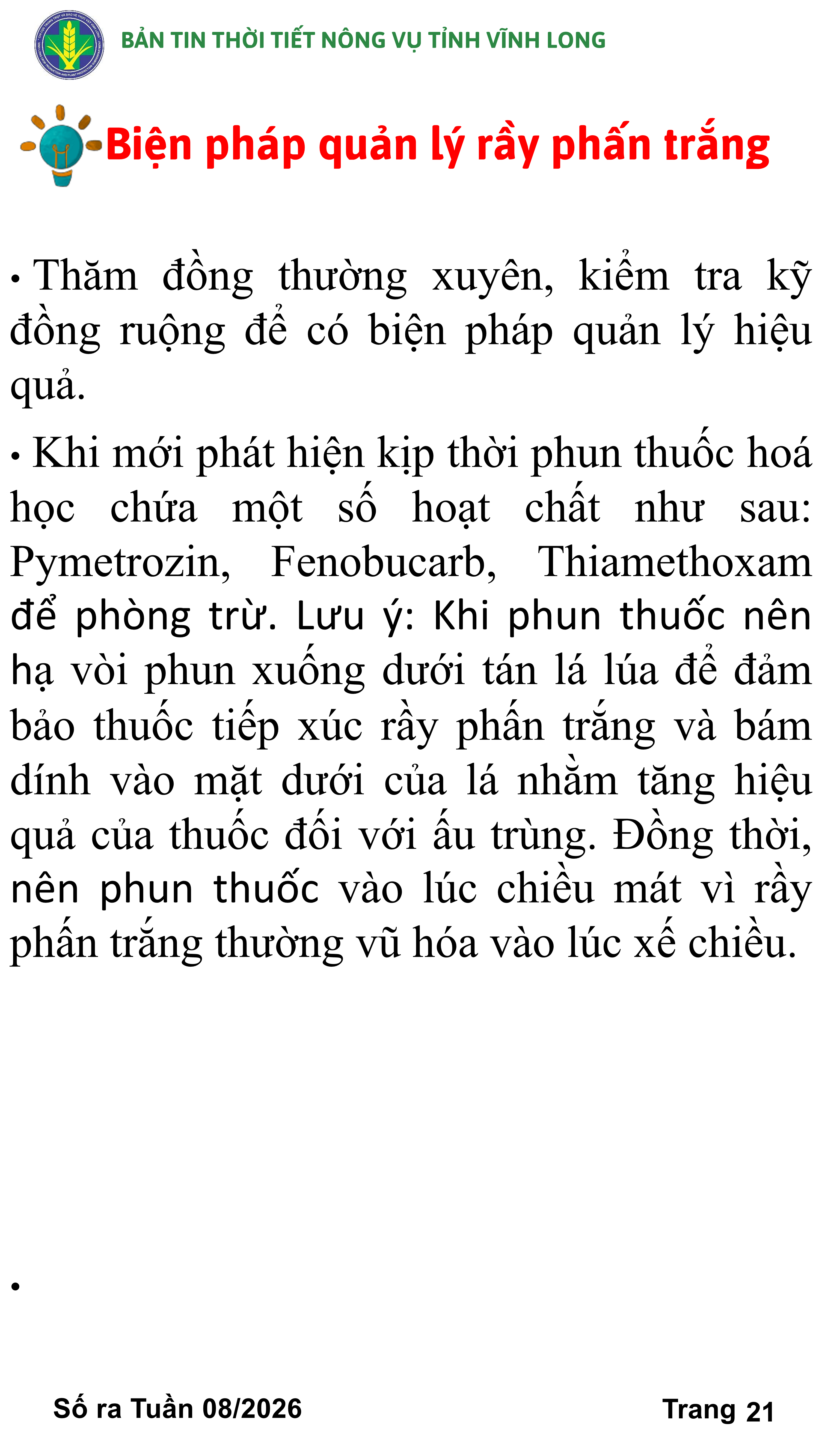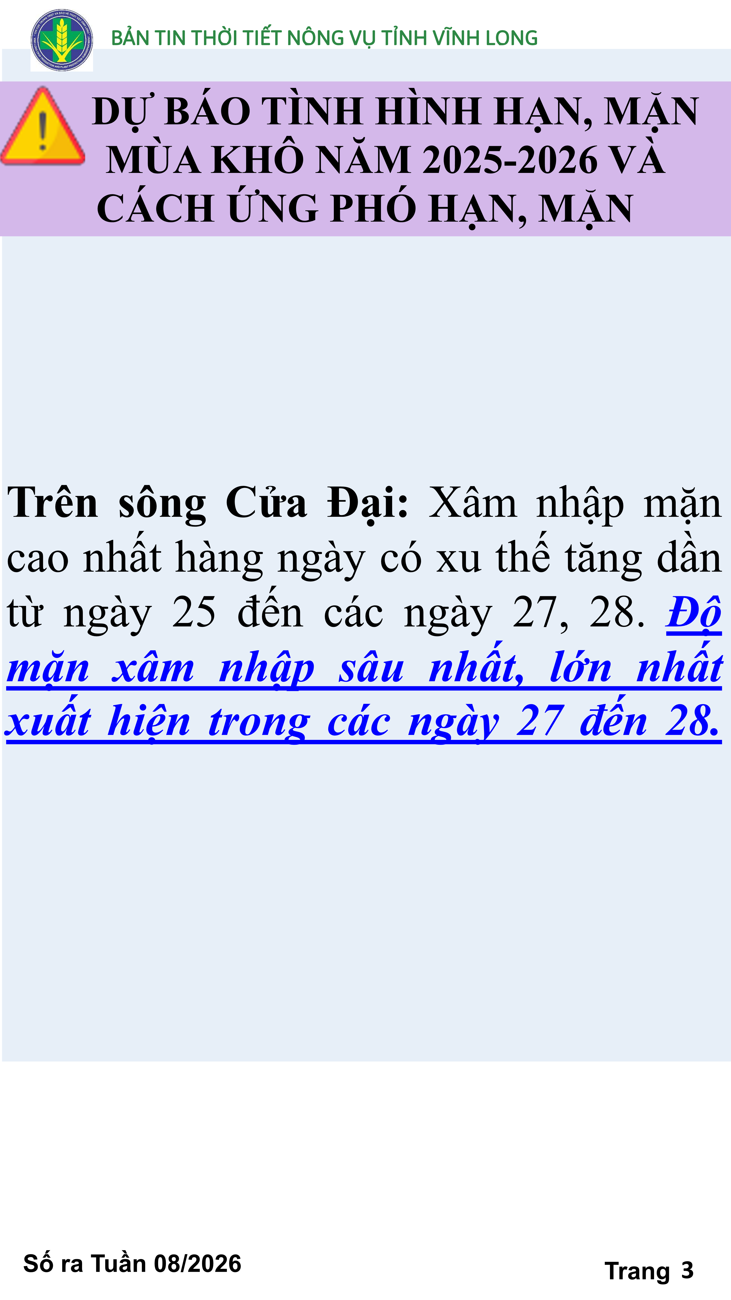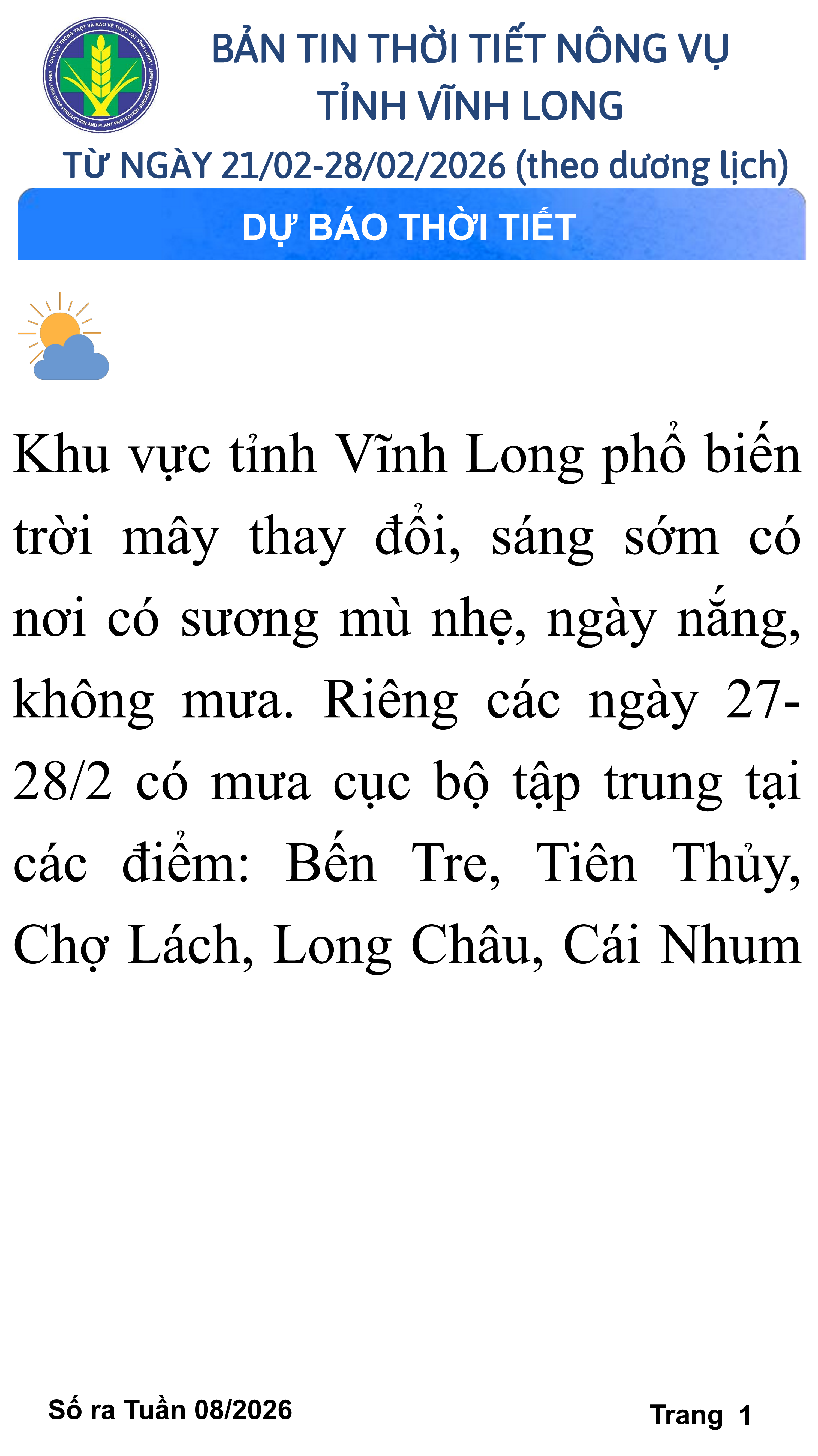 BẢN TIN THỜI TIẾT NÔNG VỤ TỈNH VĨNH LONG TỪ NGÀY 21/02-28/02/2026 (theo dương lịch)