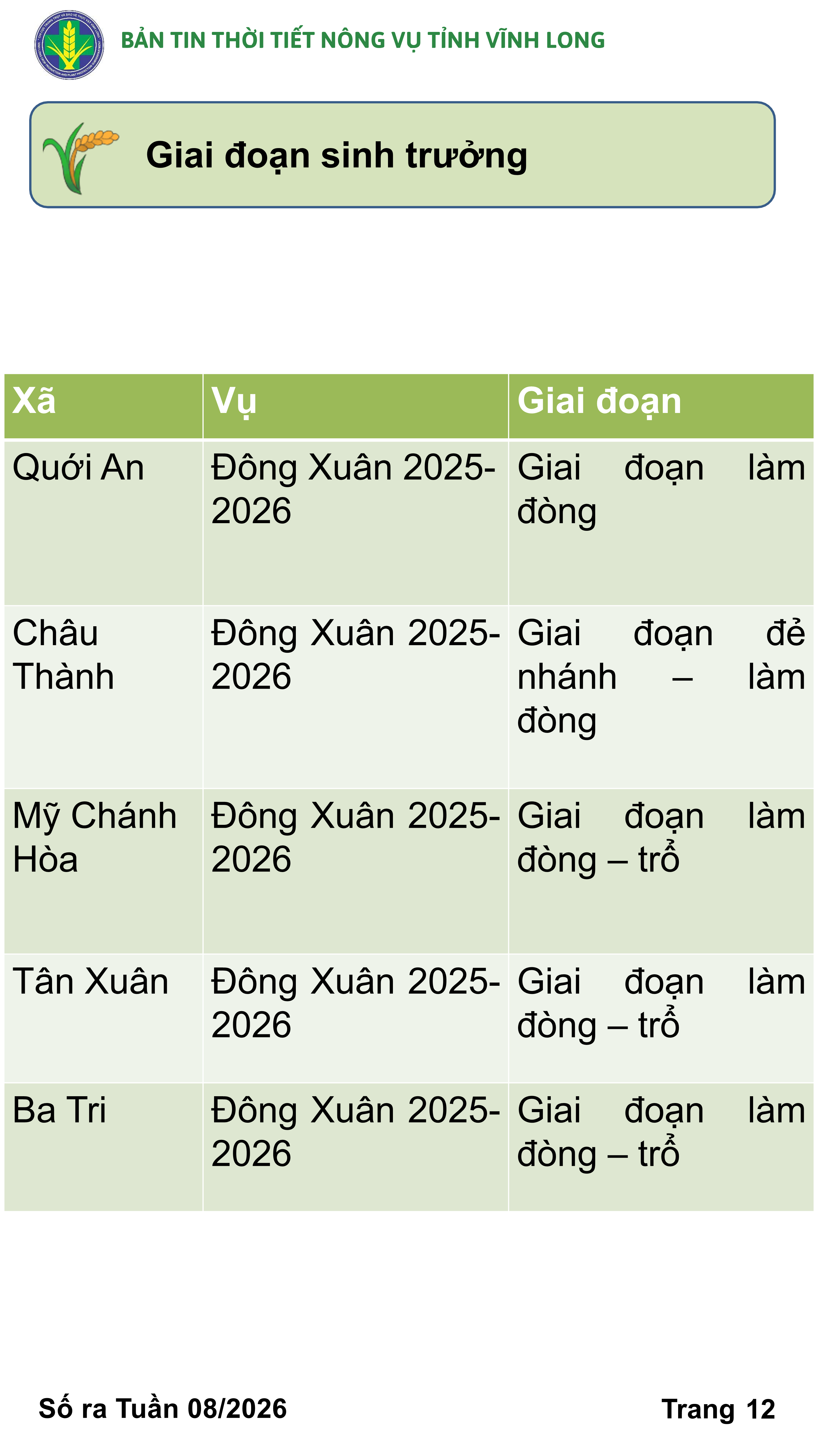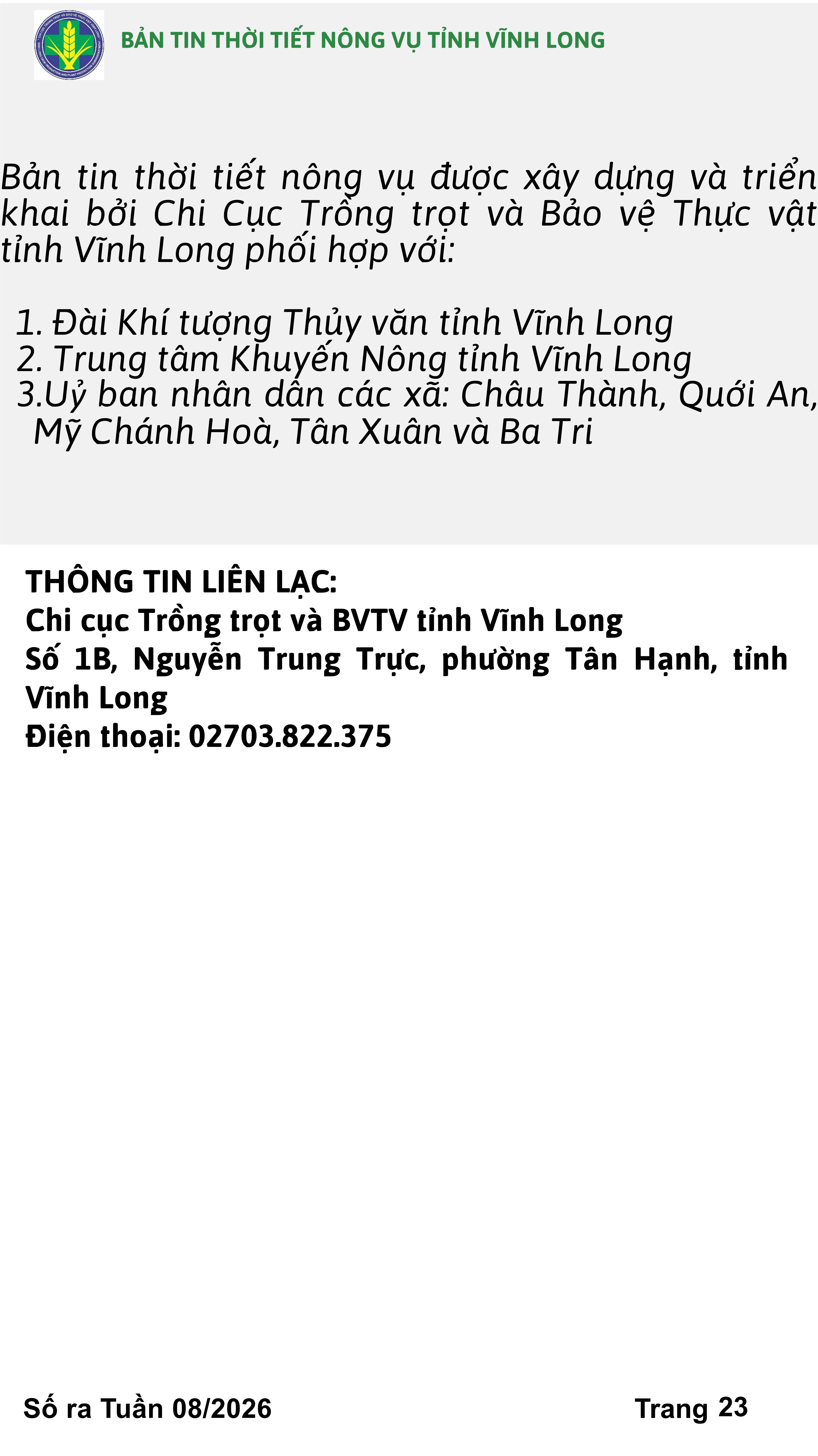 BẢN TIN THỜI TIẾT NÔNG VỤ TỈNH VĨNH LONG TỪ NGÀY 01/02-11/02/2026 (theo dương lịch)