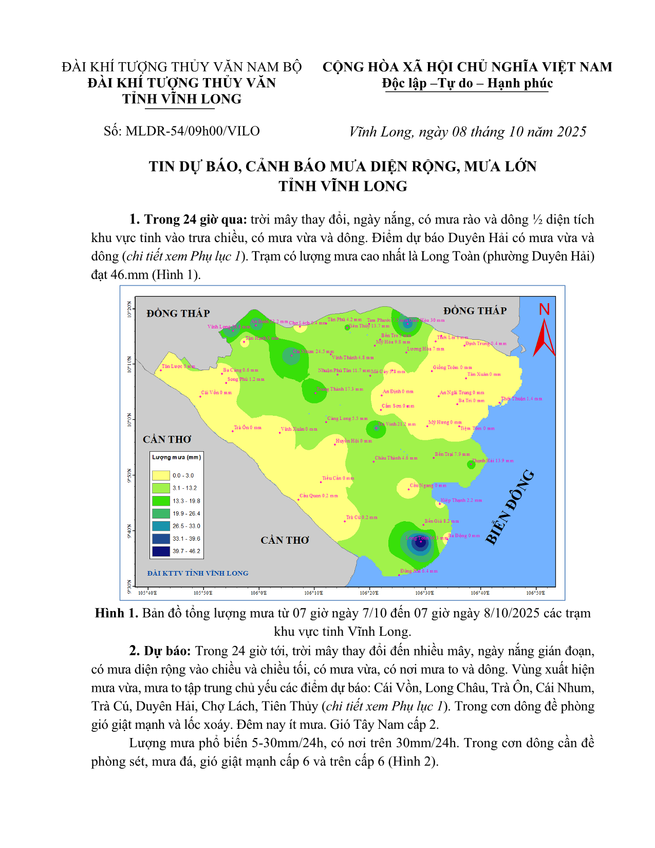 TIN DỰ BÁO, CẢNH BÁO MƯA DIỆN RỘNG, MƯA LỚN TỈNH VĨNH LONG NGÀY 08 THÁNG 10 NĂM 2025