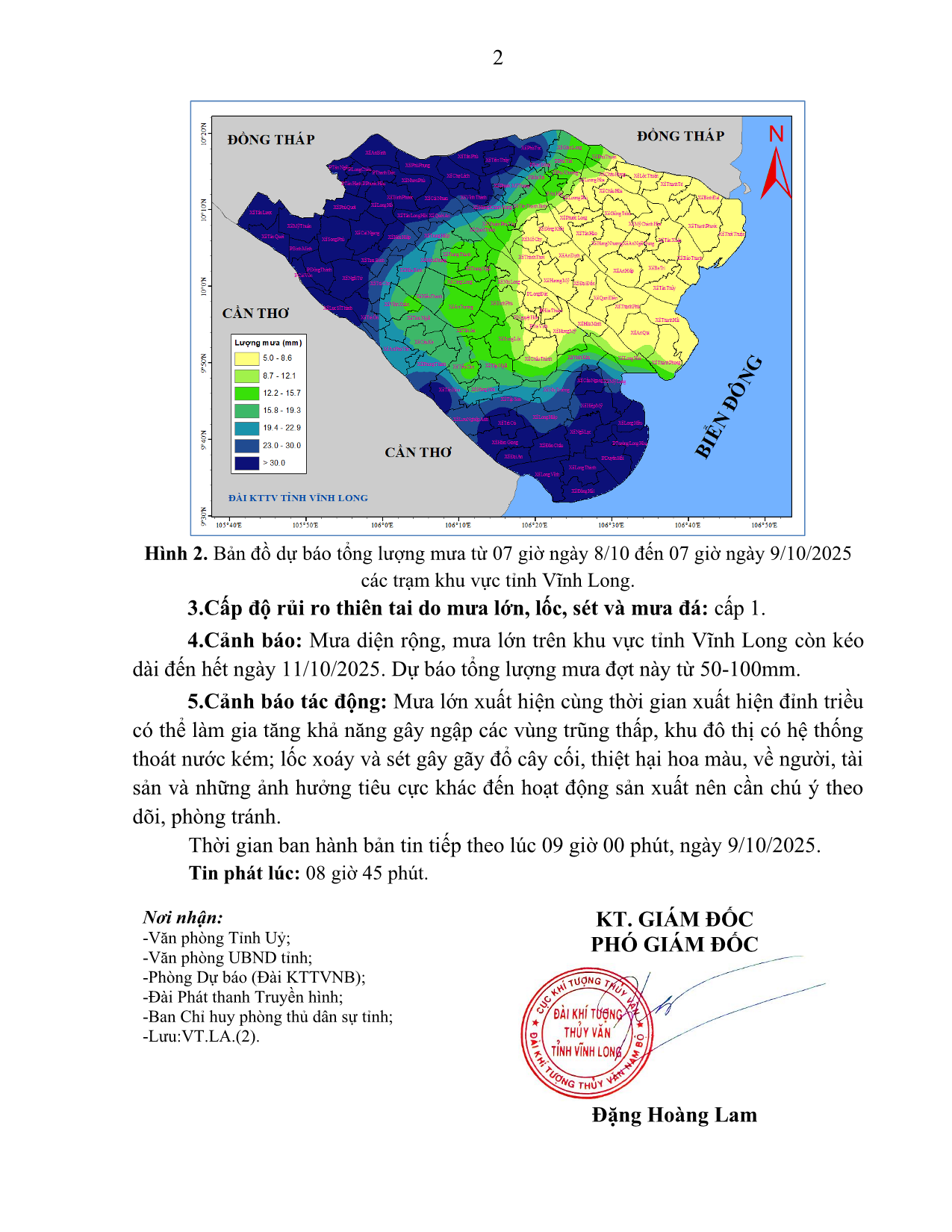 TIN DỰ BÁO, CẢNH BÁO MƯA DIỆN RỘNG, MƯA LỚN TỈNH VĨNH LONG NGÀY 09 THÁNG 10 NĂM 2025