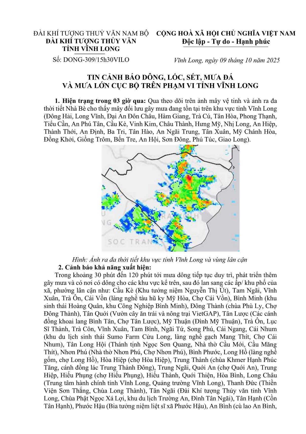 TIN CẢNH BÁO DÔNG, LỐC, SÉT, MƯA ĐÁ VÀ MƯA LỚN CỤC BỘ TRÊN PHẠM VI TỈNH VĨNH LONG NGÀY 09 THÁNG 10 NĂM 2025